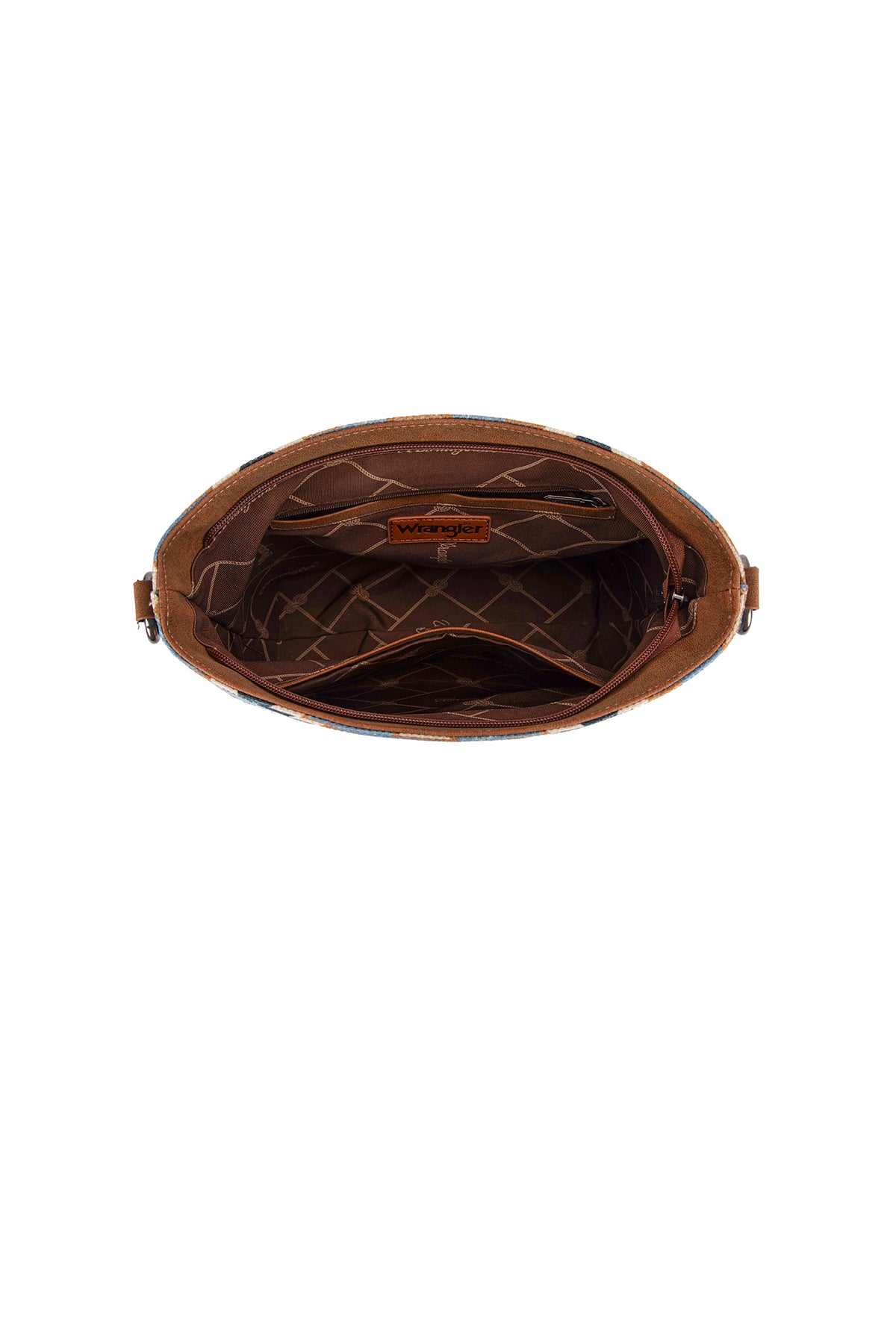 Aztec pattern print on canvas • Top zip closure • Detachable and adjustable crossbody strap • Carry handle • Back feature pocket and zip pocket • Internal zip pocket and slip pockets • Wrangler® iconic logo badge
