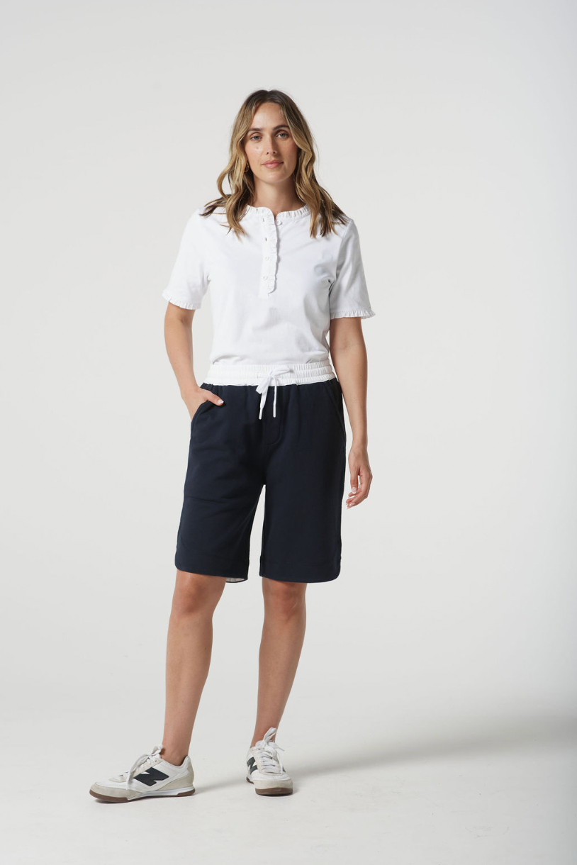 The Meadow Cotton A-Line Tee in sage and white is made from 100% pima cotton jersey in a premium yarn-dyed stripe. Designed with a boat neckline, curved hem and side seam splits, this regular fit style is soft and breathable — perfect with shorts in summer and easy to layer for transeasonal wear through all seasons.